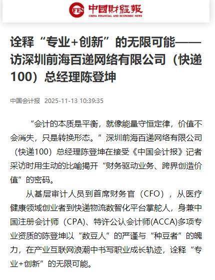 “会计的本质是平衡,就像能量守恒定律,价值不会消失,只是转换形态。”深圳前海百递网络有限公司(快递100)总经理陈登坤在接受《中国会计报》记者采访时用生动的比喻揭开“财务驱动业务、跨界创造价值”的密码。从基层审计人员到首席财务官(CFO),从医疗健康领域创业者到快递物流数智化平台掌舵人,身兼中国注册会计师(CPA)、特许公认会计师(ACCA)多项专业资质的陈登坤以“数豆人”的严谨与“种豆者”的魄力,在产业互联网浪潮中书写职业成长轨迹,诠释“专业+创新”的无限可能。转型跨界的破局之路理想与现实的差距很快显现。彼时,部分事务所规范化不足,甚至有人用专业知识“包装”不规范业务。“事与愿违”的体验促使他毅然转行,进入企业从事内部审计。2000年,陈登坤加入金蝶集团,职业轨迹迎来关键转折。他从一名普通审计人员起步,伴随公司共同成长最专业的配资公司,凭借不同岗位的历练和勇于挑战的精神最专业的配资公司,在职业生涯早期就成功晋升CFO,成为金蝶最年轻的CFO之一,被视为“年少有为”的典范。在此期间,他提出“像领导一样思考、取其长避其短”的工作理念,通过深入业务一线,将审计职能从风险控制升级为管理赋能。例如,通过经营审计访谈员工、沟通代理商、拜访客户,从财务、人力、组织、客户多视角评估企业健康度,提出的管理建议能够快速形成“发现问题—制定制度—落地执行”的闭环。这种“价值可见”的成就感,让陈登坤逐渐跳出传统财务视角,建立起全局经营思维。“职业发展的过程,其实就是公司需要和个人意愿及努力相结合的过程。机会总是留给有准备的人的,而我的准备就是把每件事做到极致。”他分享道。而后,陈登坤又迎来一场全新的跨越——从CFO转型金蝶医疗总经理,首次全面负责业务板块。“做CFO时注重规范稳健,习惯规避风险,但业务管理者则要在规范与发展间找到平衡,学会‘有节制地冒险’。”他坦言,转型初期曾被质疑“不懂业务”,却也激发了湖南人“吃得苦、霸得蛮”的韧劲。他带领团队深入医院一线,倾听行业痛点,推出全国首家移动互联网医院,有效解决“排队三小时、看病三分钟”的民生难题。该模式后来被国家卫生健康委纳入“改善医疗服务行动计划”,成为行业标杆。他主张将社会学的“结构洞理论”应用于商业实践,通过占据信息枢纽位置,整合多方资源创造价值,并创新性地采用“先上线再融资”模式,垫资为医院开发系统,用实际案例吸引银行合作。这段经历让陈登坤深刻领悟到“创新发生在跨界处”的本质。移动互联网医院的成功正是打破医院边界,连接患者、医院与金融机构的结果。业财融合的生动实践“2023年我加入快递100,想要把财务思维与物流场景深度融合,找到新的价值增长点。”陈登坤认为,快递物流看似与财务无关,实则暗藏大量可挖掘的管理价值。他敏锐察觉到快递物流轨迹信息是业财一体化管理重要源头信息和凭据,是决策有用信息。基于查快递、寄快递、管快递等不同场景,陈登坤带领团队打造多个财务赋能解决方案,让物流轨迹成为企业经营“数字凭证”。例如,收入确认解决方案助力企业形成订单流、资金流、物流、信息流的“四流合一”和财务确认闭环,大幅提升合规操作与协同管理效率。对于B2C企业,快递轨迹的“已签收”节点可作为收入确认的关键依据——商品发出时,轨迹显示“在途中”,会计科目从“库存商品”转为“发出商品”;客户签收后,所有权转移,方可确认收入并结转成本。“某知名房地产企业2023年销售24万套新房,通过快递100对接EMS轨迹,以签收记录作为物业费起算和收入确认的凭证,避免了传统邮政回执往返付费、效率低下等问题,单套房屋成本降低50%。”陈登坤以具体案例说明成效。函证业务一直以来都是困扰审计质量提升的痛点。快递100旗下“百递云·API开放平台”推出的会计师事务所函证中心解决方案能够实时获取函证的寄出、在途、签收等全链路物流轨迹信息,自动生成完整的函证过程记录。不仅解决传统审计中的“信息孤岛”问题,更将物流数据提升为财务与审计决策的关键输入,真正实现“物流即凭证、轨迹即证据”的业财融合范式。从聚焦审计领域的专业解决方案,到延伸至企业通用的物流成本管控,快递100的服务逻辑始终围绕“用数据打通业务断点”展开,而这一思路在快递100的另一款核心产品“百递云·企业快递管理SaaS”中也得到进一步深化。在陈登坤看来,物流成本的降低是“净利杠杆”,企业节省1元成本相当于创造10元利润。快递100致力于解决企业员工寄件“报销繁琐、成本难控”问题,“百递云·企业快递管理SaaS”将寄件系统与企业微信、钉钉、飞书及财务系统打通:员工在办公平台下单,系统自动记录部门、人员、事由;企业统一与快递公司结算,对账效率大幅提升;财务可穿透分析各部门快递量、成本占比,实现精细化管控。“真正的专业是能在不同领域找到共性规律,用财务思维破解业务难题。”在快递物流数字化的赛道上,陈登坤正带领团队继续探索,让财务赋能成为企业降本增效的确定性力量,开创并引领中国快递物流信息云服务新业态新模式。面向未来的专业坚守“ACCA不仅是一张证书,更是一套具有前瞻性和系统性的思维体系。”谈及与ACCA渊源,陈登坤回忆,2000年前