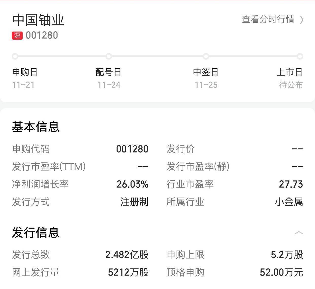而11月21日启动申购的深主板新股中国铀业,将发行2.482亿股。作为我国天然铀保障供应的“国家队”“主力军”,是中核集团下属专注于天然铀和放射性共伴生矿产资源综合利用的核心平台,主营业务涵盖天然铀采冶、销售及贸易,以及独居石、铀钼、钽铌等放射性共伴生矿产资源综合利用及产品销售。