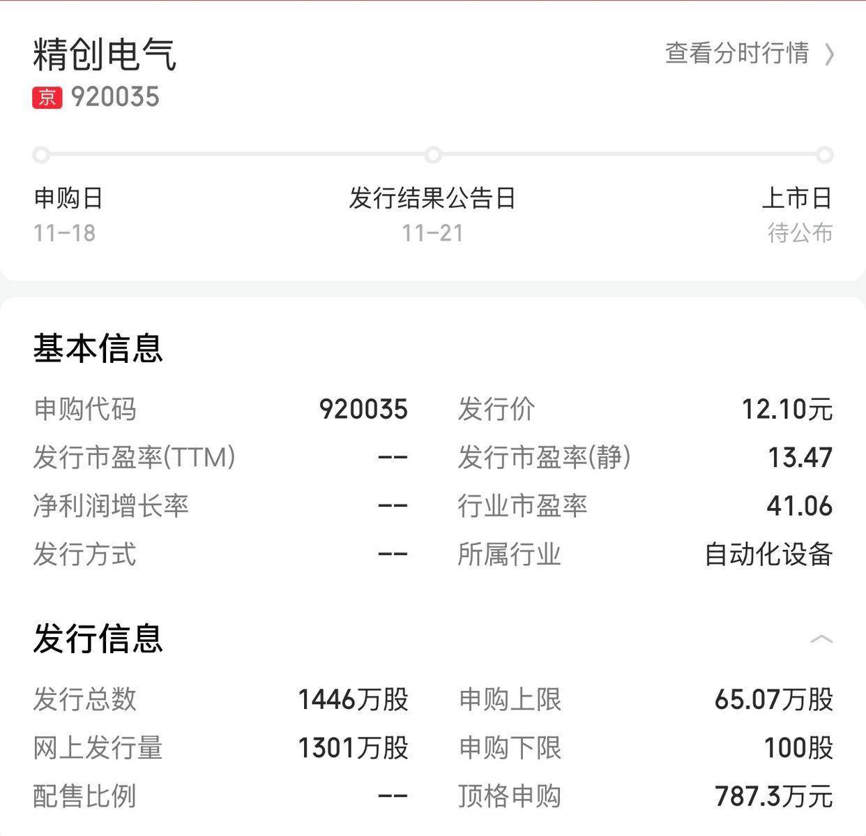 具体来看,精创电气发行价为12.10元/股,发行市盈率为13.47倍,参考行业市盈率为41.07倍,顶格申购市值需787.3亿元。