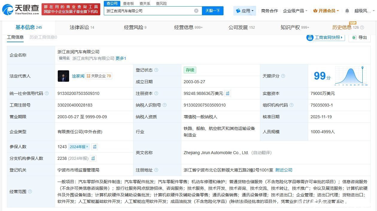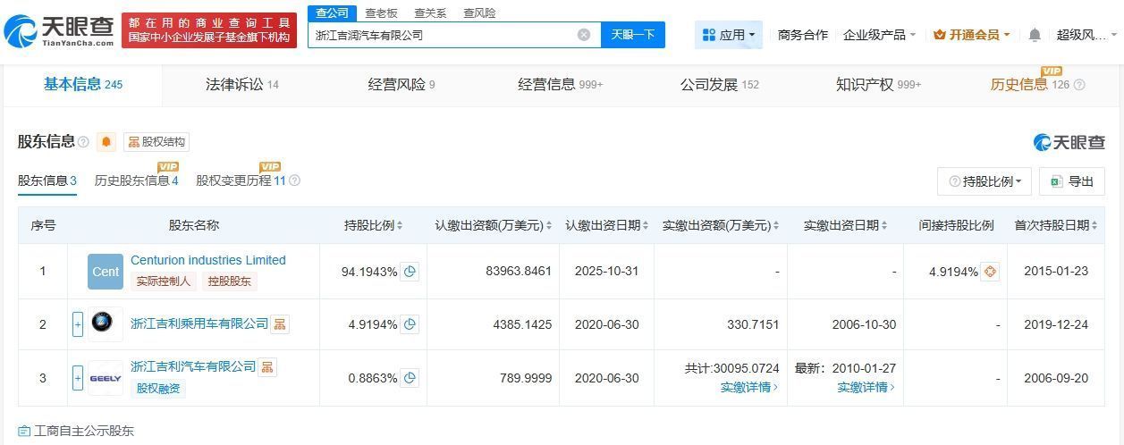 天眼查工商信息显示,近日,浙江吉润汽车有限公司发生工商变更股票配资正规平台排名,注册资本由约8.9亿美元增至约9.9亿美元,增幅约11.3%。该公司成立于2003年5月,法定代表人为淦家阅,经营范围包括汽车零部件及配件制造、汽车零配件批发、汽车零配件零售、机动车修理和维护等。股东信息显示,该公司由Centurion industries Limited、浙江吉利乘用车有限公司、浙江吉利汽车有限公司共同持股。
