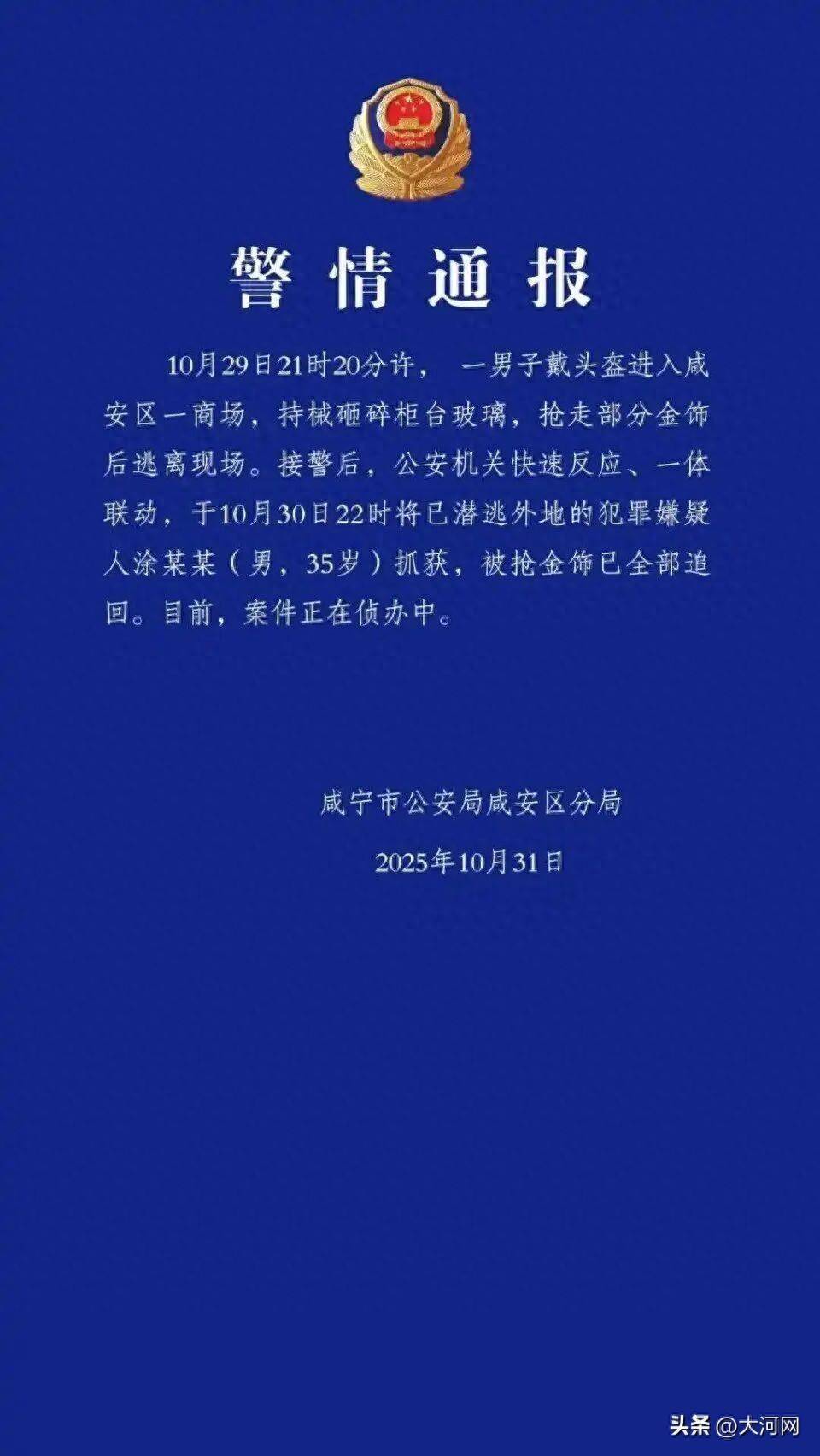 10月31日,湖北咸宁市公安局咸安区分局发布警情通报:10月29日21时20分许股票配资正规平台排名,一男子戴头盔进入咸安区一商场,持械砸碎柜台玻璃,抢走部分金饰后逃离现场。