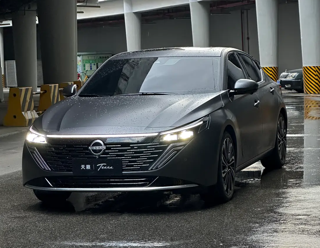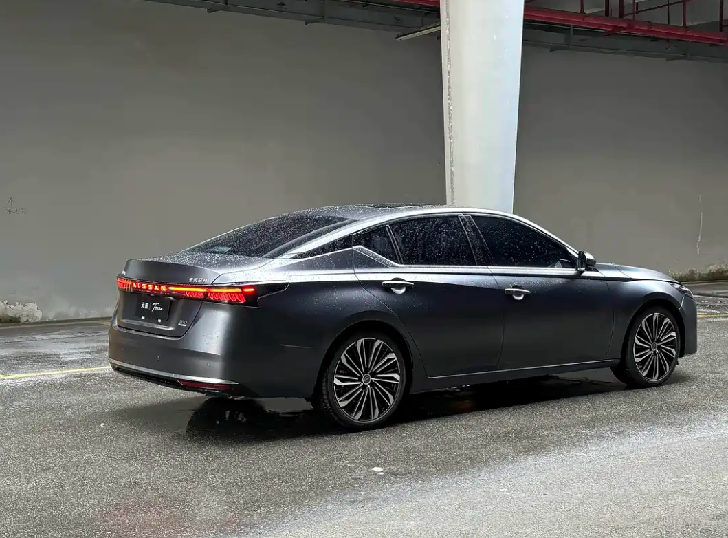 外观设计更显凌厉动感,沿用V-Motion设计语言,大面积熏黑一体式进气格栅搭配密集镀铬饰条,气场十足。寰宇双子星LED大灯与超长贯穿灯带相连,尾部发光“NISSAN”标识搭配红宝石贯穿尾灯,夜晚点亮辨识度拉满。新增幻影紫、羽砂灰等潮流配色,19英寸钻面光刃轮毂兼具颜值与低风阻性能,溜背式车身与小鸭尾设计强化运动气质。