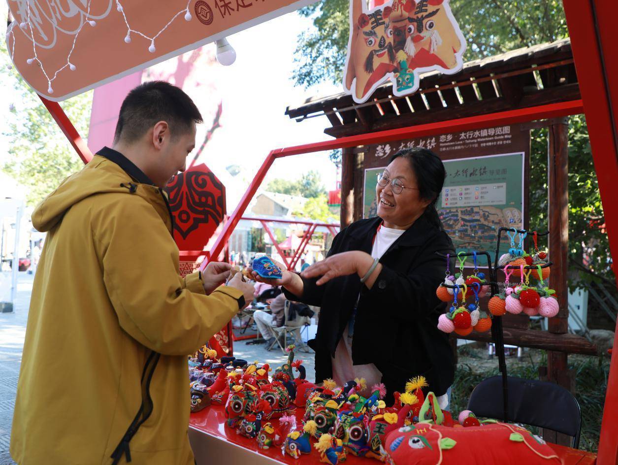 9月19日,在易县太行水镇非遗展区内,游客在选购“布虎头”非遗产品。张仕儒摄