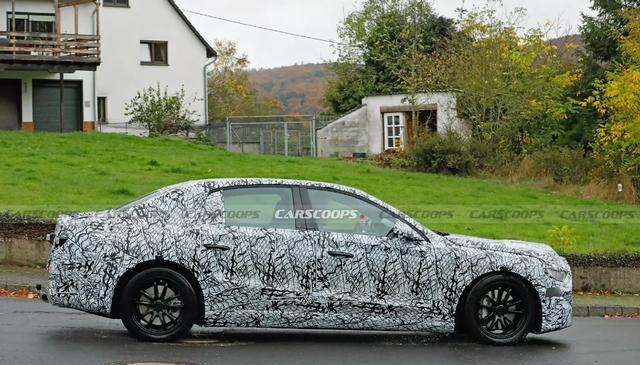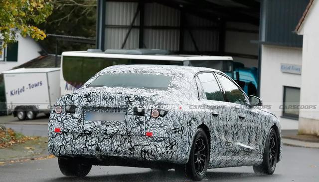 在海外公路上测试的奔驰E级EQ身上,大量黑白迷彩伪装几乎遮挡了所有主体造型,但通过一些轮廓变化,还有此前官方曝光的信息,这台中大型纯电动豪华轿车还是有不少值得一看的地方。从车头造型来说,大灯还占有一些临时设计,但无论是明显的边框分界线,还是下方对应的小尺寸导流,车辆都会沿用一体式大灯,并稍稍调整日行灯的造型与相对位置,实用性会成为这次设计的重点。除了灯组,它的大号尺寸格栅预计会与奔驰GLC级、C级纯电动版本保持大体一致,仅仅是在前保险杠内保持少量气孔。很明显,这些处置除了提示了奔驰通用的新一代家族设计语言外,也意味着一些务实考虑会成为新批次奔驰的重点。